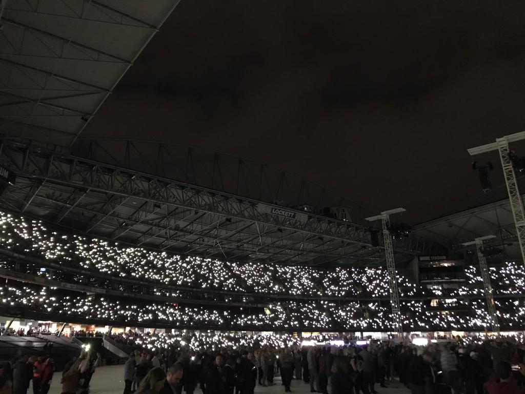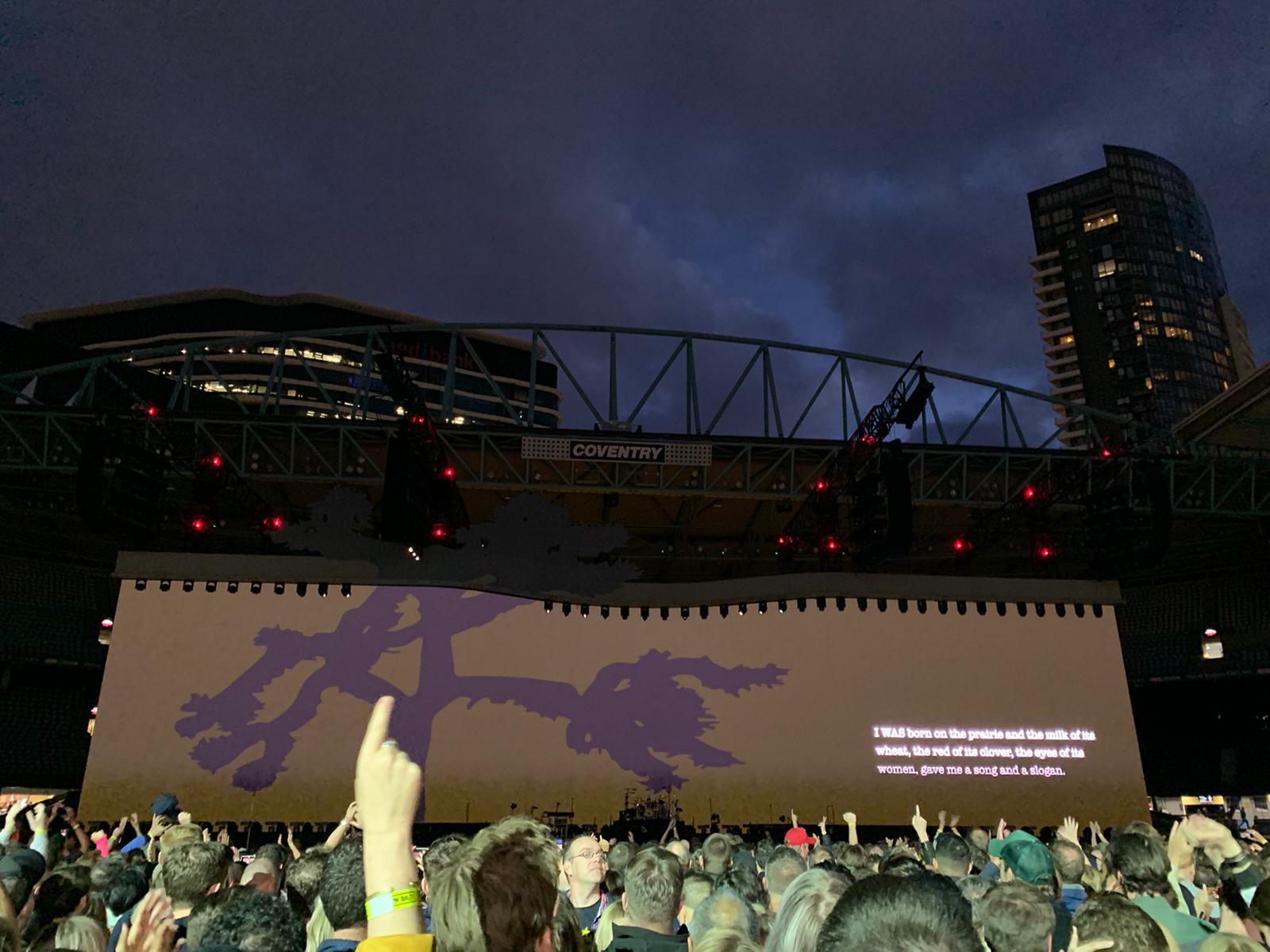 Um 20:45 Ortszeit eröffnete U2 dann wie gewohnt mit Sunday Bloody Sunday. Es folgte (erstmals auf dieser Tour) überraschend I Will Follow und im Anschluß dann New Year's Day. Während Bad danke Bono erneut den Firefighters, die die schweren Buschbrände bekämpfen und baute ein Into My Arms Snippet von Nick Cave ein. Nach America, Fall At Your Feet und Beds Are Burning bereits das vierte Snippet während Bad auf dieser Tournee.