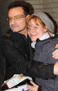 Aber zurück zum Warten im Foyer. Ein leicht debiles Grinsen machte sich breit, von Müdigkeit war nix zu merken, als wir One mithören durften. Die spielten das nur für uns. Also quasi nur für uns. Mittlerweile war es kurz nach ein Uhr und plötzlich klopfte Bonos Security an das Fenster… es war soweit: In der Einfahrt zu den Hansa Studios nahm sich Bono kurz Zeit für uns, signierte mein Liniennetz und ließ bereitwillig Fotos von sich machen. Endgültig ins Herz geschlossen hatte ich seinen Security, als er von sich aus anbot, ein Foto von uns vieren zu machen. Das nenn ich mal Fanbetreuung! Auf die Frage, ob sie "Always Forever Now", was er auf mein S- und U-Bahnplan schrieb, auch auf kommenden Konzerten spielen wollten, antwortete er leider mit nein, aber die Frage nach neuem Material entgegnete er ein hoffnungsvolles: "We’ve got something cookin’ up." Aber auch das kann alles und nix heißen. Bono war ziemlich in Eile, es war ja schon spät und ich muss auch gestehen, meine Zeitwahrnehmung war nicht ganz da, jedenfalls ging der Moment viel zu schnell vorbei. Reichte aber dennoch für ein noch breiteres debiles Grinsen.Ins Herz schloss ich dann auch den unseren Security, der mittlerweile nur noch für mich da war, weil die beiden anderen entweder nach Hause oder zum Kaffee holen gegangen waren. Er brachte mir eine Tasse seines – für die Nachtschicht reservierten - Kaffees. Und so saß ich auf der Fensterbank mit der wärmenden Heizung von unten und dem wärmenden Kaffee in den Händen und lauschte Edges zauberhafter Gitarre. Die Jungs von der Produktion meinten, er hat "nur" 20 Stück mit. Aber diesmal war ich mir sicher, dass er nur für mich spielte.